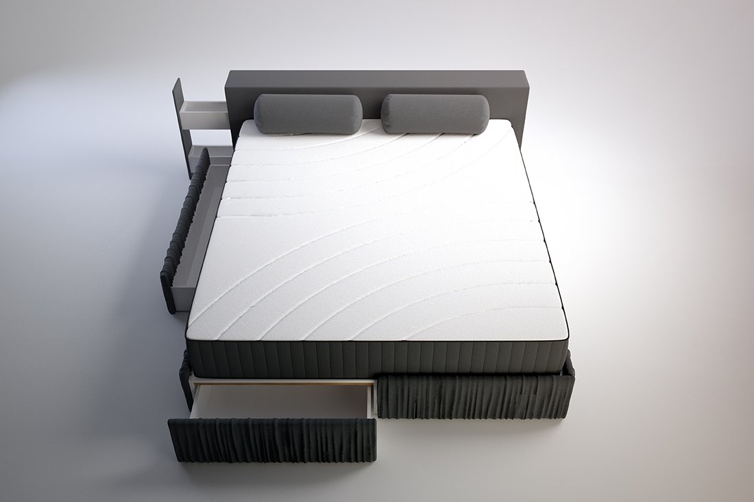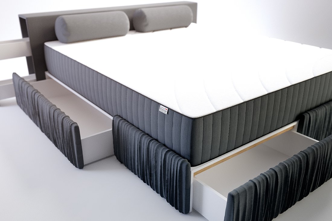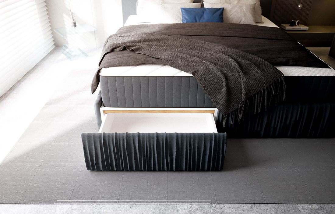 Výjimečnou vlastností této postele je řada chytrých úložných řešení. Zahrnuje čtyři prostorné výsuvné zásuvky – po dvou na každé straně – které poskytují dostatek místa na ložní prádlo, sezónní oblečení nebo jiné nezbytnosti. Tyto zásuvky jsou hladce integrovány do rámu a zachovávají elegantní a stylový vzhled postele. Vysoce kvalitní posuvné mechanismy zajišťují plynulý a snadný přístup k uloženým věcem.