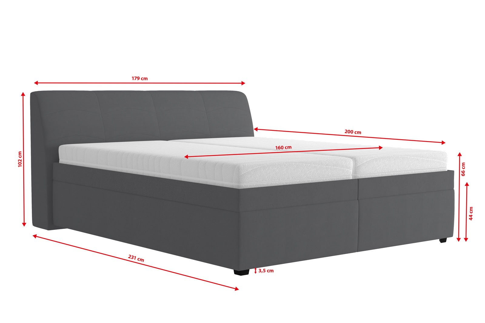 Moderní dvoulůžko Merkur je vyráběno v rozměrech 160x200 a 180x200 cm.
