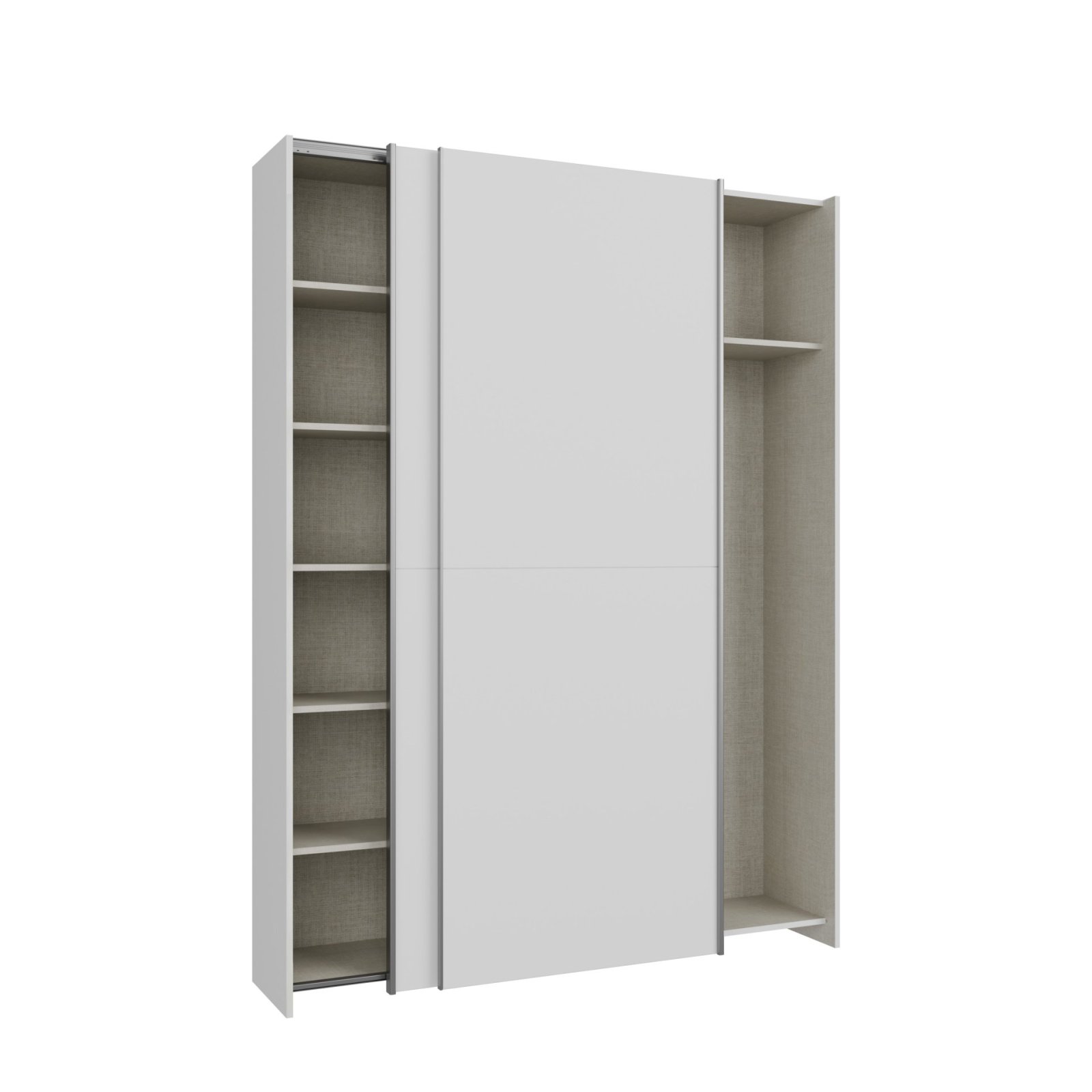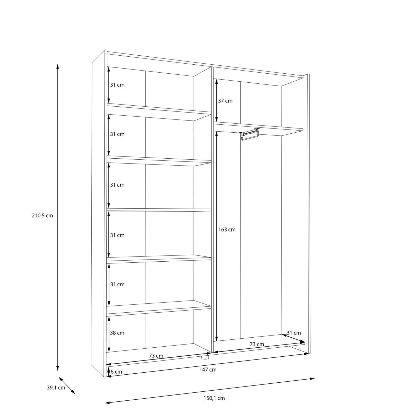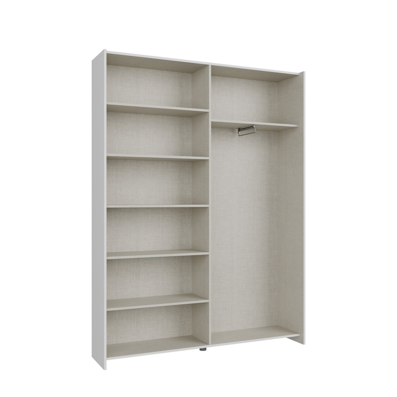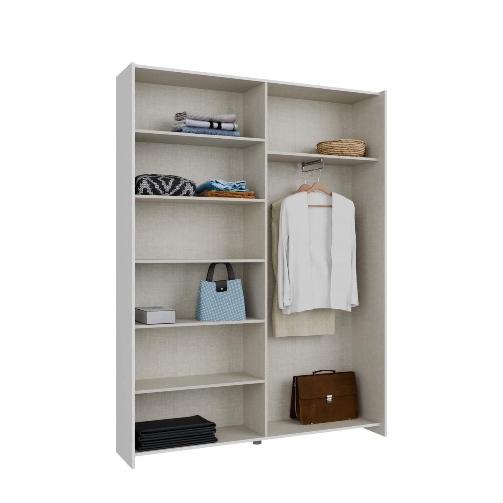 Vnitřní uspořádání je navrženo jako kombinované, takže poskytuje maximální využití prostoru. Jedna část je vybavena šatní tyčí, ideální pro zavěšení košil, šatů nebo kabátů. Druhá část obsahuje větší množství polic, které jsou perfektní pro složené oblečení, doplňky nebo úložné boxy.